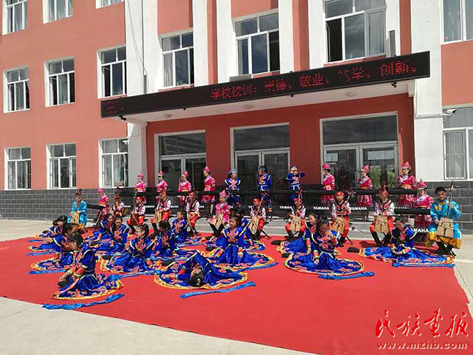 農(nóng)牧民的孩子們?cè)诩议T(mén)口的小學(xué)里也能接受到專(zhuān)業(yè)系統(tǒng)的藝術(shù)教育,圖為孩子們?cè)谶M(jìn)行才藝表演