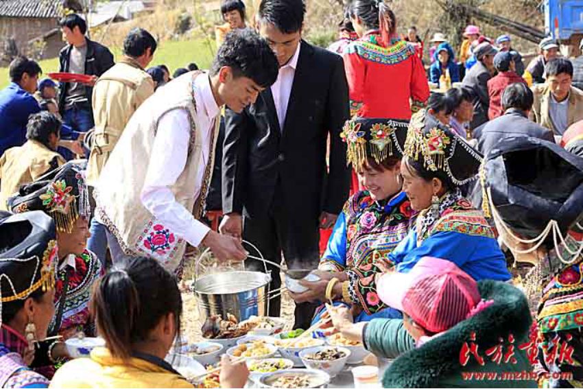 穿長(zhǎng)衫,戴著包頭的新郎,把新娘接入正堂屋,將送親的人群迎進(jìn)臨時(shí)搭建的青棚屋休息。青棚,是傈僳族人辦婚事時(shí)砍來(lái)毛櫟樹(shù)、香樹(shù)枝等臨時(shí)搭起的棚子。既清新又涼爽舒適。可以用來(lái)接待賓客,也可以作為跳舞、唱曲子的活動(dòng)場(chǎng)所。晚餐就在青棚里進(jìn)行,宴席一般不用桌子,酒菜擺在青棚下面鋪好青松毛的地上,客人八個(gè)一圈,席地坐在青松毛上,圍著喜筵,既歡樂(lè)又開(kāi)心的喝著美酒、品嘗佳肴。晚飯菜肴十分豐盛,足見(jiàn)主人家的好客和廚師的高超手藝。菜出雙不出單,菜的顏色出紅不出白。一切都象征著成雙成對(duì),吉祥如意。