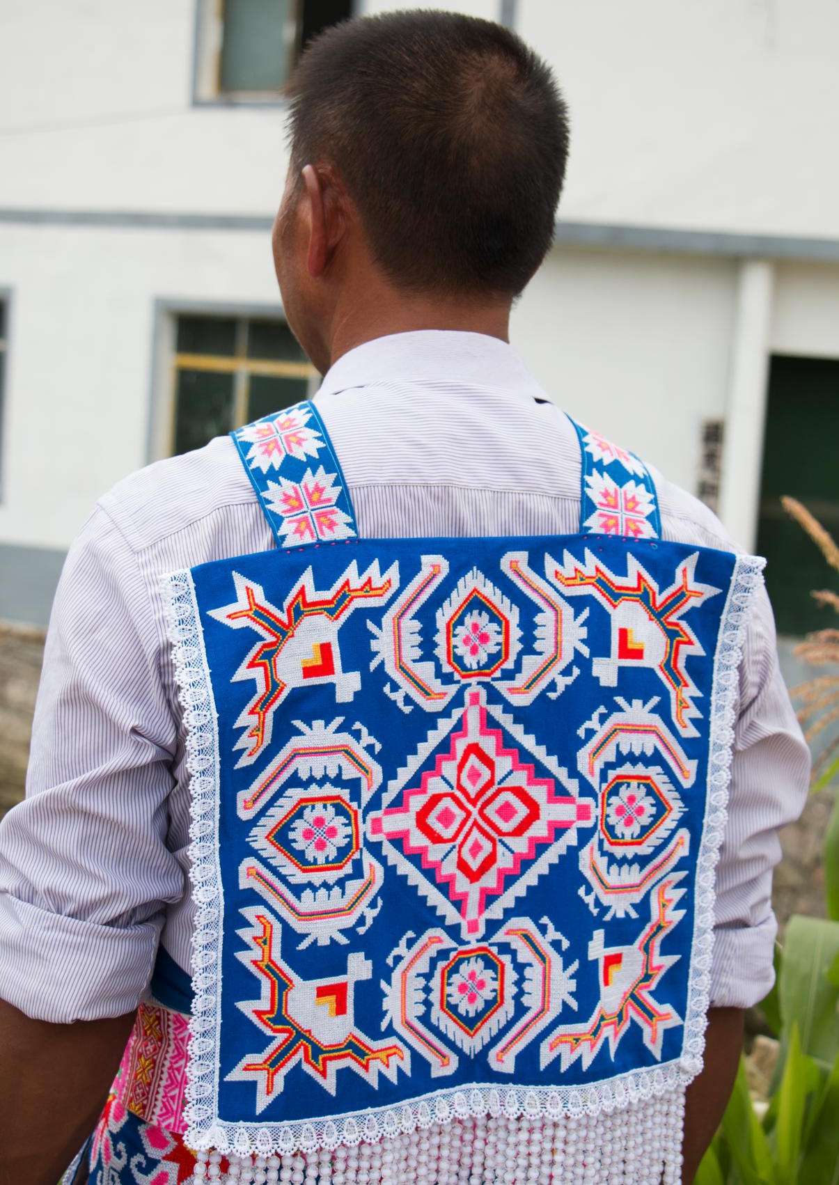 谷立村男子服飾相對于苗族女子服飾則顯得較為簡樸,男子上身主要穿著白色打底的對襟衣,身后背有背牌,背牌底色為藍色,上繡有花朵圖案作為裝飾。下身主要以藍色打底的圍裙為主,身前圍裙,上面布滿刺繡圖案。身后的圍裙則為一條條獨立的絲帶,絲帶上同樣布滿花紋刺繡圖案,在其底部還串有珠簾作為裝飾。