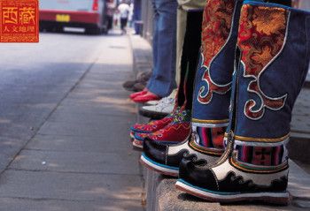 西藏高原地域遼闊,每個地區(qū)都有屬于自己的鞋子。藏族男女鞋,外觀雖然很像舞臺上古裝戲里穿的靴子,但用牛皮做底,底高二寸,腰高至小腿之上,鞋面用紅綠相間的毛呢裝飾,鞋腰也有線條、花紋,鞋幫用各色絲線或各色皮革、氆氌、金絲緞制成。人們能從一個人所穿的鞋子判斷出一個人的職業(yè)和社會階層。