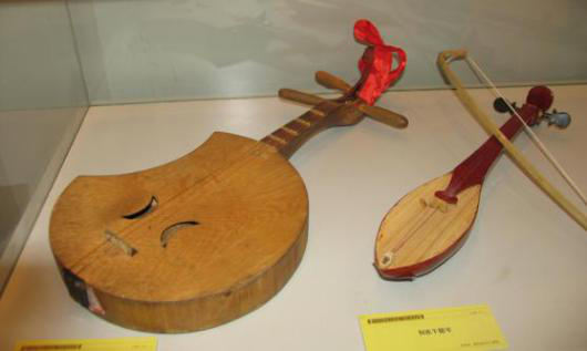侗琵琶:彈撥樂器,侗語稱“必巴”,漢語稱“侗琵琶”,有大、中、小三種類型。形狀與三弦相似,用牛角撥片演奏。常用于獨(dú)奏及侗歌伴奏(圖為侗琵琶和牛腿琴)。