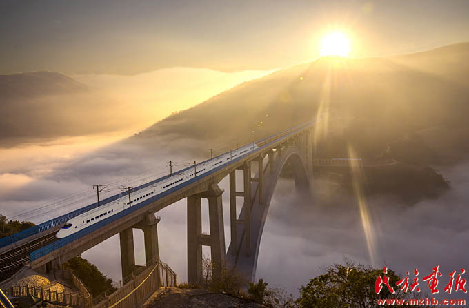 改革開(kāi)放40年來(lái),少數(shù)民族和民族地區(qū)成為改革開(kāi)放的切實(shí)受益者,2017年1月1日,滬昆高鐵線(xiàn)上的列車(chē)沐浴著新年的陽(yáng)光飛馳在云貴高原上(史家明 攝影)