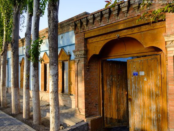 維吾爾族的居室一般是土木結構平房,其建筑方式是以粗木或沙石作基,土塊砌墻,或笆子墻,房頂架梁檁、椽后鋪葦席加土抹泥。房屋平頂,開天窗采光,四壁不開窗只留門,房門忌朝西。現在,建筑式樣發(fā)生變化,多留壁窗,建材也多由土木結構,向磚、混凝土結構發(fā)展。室內布置過去較為簡單,一般多砌土炕,炕一側隔矮墻砌鍋臺,墻上留有壁翕,放置物品,喜掛壁毯。冬季多燒爐子、火墻取暖。院內多植有葡萄和果樹花卉。房門口兩側砌土臺,上鋪氈毯,用以夏天乘涼、睡覺。