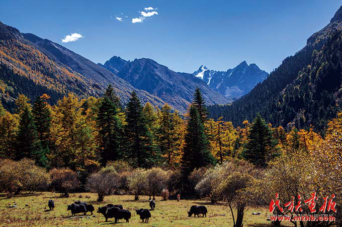 甘孜州的藍天白云、安詳牧群,金黃色西洋油畫般的美景吸引著八方游人(民族畫報社 列來拉杜攝影)