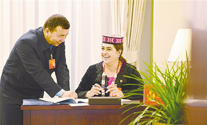 黨的十九大新疆代表團(tuán)駐地里,米日姑麗·艾克米汗和吾布力喀斯木·買吐送代表(維吾爾族)談起五年來家鄉(xiāng)的巨大變化非常開心,“百姓富了,家鄉(xiāng)美了,來自全國的客人也多了” (高興貴 攝影)