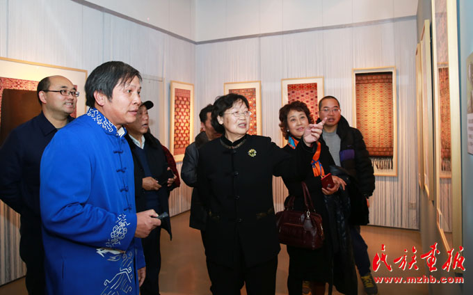 座談會(huì)上,中國(guó)民族博物館副館長(zhǎng)張志文介紹說(shuō):土家族是一個(gè)古老的民族,有著4000多年的文明發(fā)展史。土家族在全國(guó)有2個(gè)自治州、8個(gè)自治縣,人口達(dá)835萬(wàn)。土家織錦從秦漢時(shí)期萌芽,歷經(jīng)賨布、溪布、斑布、土錦等幾個(gè)發(fā)展階段,在明、清時(shí)期開始定型,至今已有2000余年的燦爛歷史。中紀(jì)委駐財(cái)政部紀(jì)檢組原組長(zhǎng)、全國(guó)婦女手工編織協(xié)會(huì)副會(huì)長(zhǎng)賀邦靖說(shuō):土家織錦是土家婦女智慧的結(jié)晶,是武陵山區(qū)文化精準(zhǔn)扶貧的重點(diǎn)項(xiàng)目之一。從這個(gè)展覽上我們不僅可以看到土家織錦的燦爛與美麗,還可以看到國(guó)家實(shí)施文化精準(zhǔn)扶貧的實(shí)效。