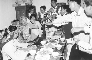 接著婚宴開始,八音隊(duì)吹奏的樂曲優(yōu)美動聽,大家喝喜酒祝賀新郎、新娘;同時(shí),男方家的帶娘給女方家人開檳榔碗。開檳榔碗的順序是女方家人由老到小分別接檳榔碗,意在感謝女方長輩、親屬對新娘的養(yǎng)育之恩。