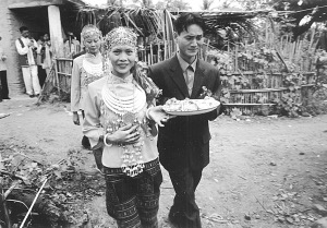 上午10點(diǎn),新娘要“回返”娘家。伴娘挑著兩只籮筐,一邊放有糯米和豬肉,另一邊放著一件衣服。這件衣服只能是黑色或藍(lán)色,不能是花色和白色。據(jù)說花衣服新娘穿了會花心,白色則不吉利。這件衣服是婆婆特地送給新娘的,今后一定要穿。新娘和伴娘一起走在回返的路上,新娘舍不得離開婆家,走到村口,就把糯米飯和豬肉分給過路人吃,以示新娘的熱情好客。我也吃了籮筐里的糯米飯和豬肉,覺得很香,很好吃。之后,新娘和伴娘不再往娘家走,而是返回了婆家。