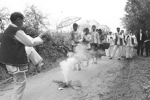 迎親隊(duì)伍出村口時(shí)要“過火堆”,求吉利