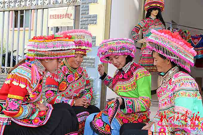 搬遷到傈園新村后,安學(xué)芬(左二)和妹妹安學(xué)珍在政府的扶持下辦起了刺繡手工坊,為了提高繡品質(zhì)量,他們經(jīng)常與同村婦女進(jìn)行刺繡手藝交流