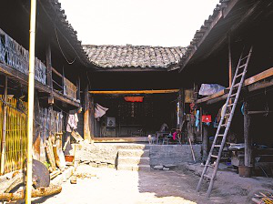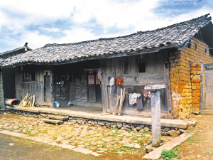 廚房大都在左間,地中間橫砌土臺(tái)鍋灶,上面是兩口大鐵鍋??亢髩κ谴毒摺⒉途?,前面是石碓,平時(shí)搗豬飼料,節(jié)日搗粑粑,用石碓搗的辣椒面也格外好吃。右間大都是家長的居室,只放木床。兩側(cè)廂房與主房分離,木板梯上下。一側(cè)下層是豬圈、牛欄,上邊存干草;另一側(cè)下面堆放糧食、燒柴、摩托車,上層是未婚子女的臥室,有廊道、腰欄。院落小的,在主房對面設(shè)牛欄,砌土坯墻圍成獨(dú)立的合院。