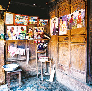 隴川縣戶撒鄉(xiāng)曼旦寨是阿昌族古老的村寨之一,明、清時(shí)期的老宅皆以楠木建造,數(shù)百年不朽、無蟲蛀。受漢族文化影響,傳統(tǒng)民居大都是土木石結(jié)構(gòu)的三合一照壁或四合院落。正房建在長方石條加土方壘起的屋基上,屋基下為院壩,以三層石階上下。正房三開間,四排五柱,中柱起脊,形成雙斜面屋頂,上覆凹型青瓦。后墻和兩側(cè)山墻以土坯砌筑,外面不抹泥,左右是廂房或照壁。室內(nèi)隔墻均為木板,中間一間為堂屋,有一米多寬的吞口,六扇雕刻的木板門,平時(shí)只開中間兩扇。兩邊的檐柱頭有粗獷的木雕。吞口有走廊的作用,一般左側(cè)角設(shè)臉盆架以供洗漱,板壁上掛小鏡框以便梳妝,旁邊掛著家人的照片。有的擺著縫紉機(jī),有的放藤椅小憩。右側(cè)放臨時(shí)的農(nóng)具,掛衣服,板壁上貼著影視明星的招貼畫。堂屋正面板壁是通高的木雕佛龕,供奉佛像和傣文的經(jīng)文,龕楣上貼著三至四層掛錢,下面有燭臺(tái)、香爐。左側(cè)擺著電視機(jī)、熱水瓶、茶桌,板壁上掛著戶撒刀和手工編織的背兜,右側(cè)有專供老人休息的床或藤椅,也有的砌火塘,火塘的小土臺(tái)上放著炒菜的調(diào)料、火柴和照明燈具。