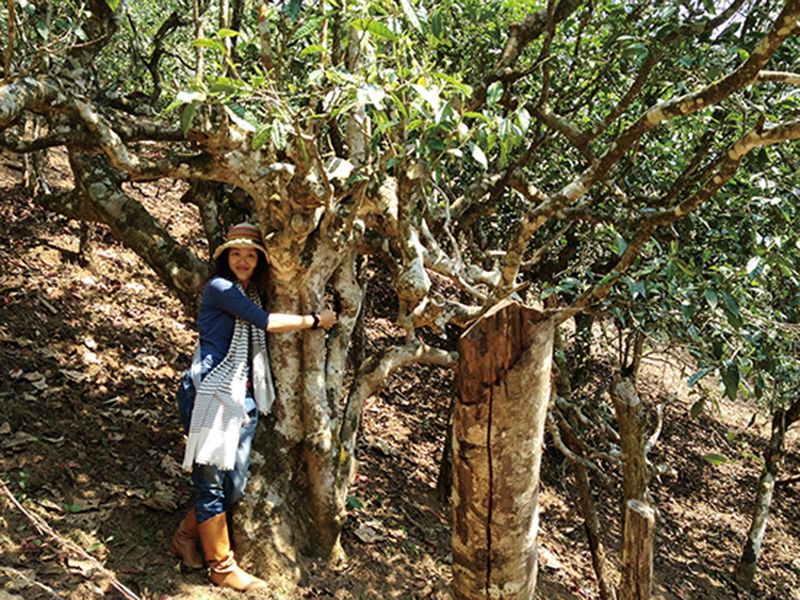 又走了一段,老茶樹開始出現(xiàn)在路邊。老茶樹主干與人的大腿等粗,萍芳家70年茶園茶樹主干也就手臂粗,長成大腿粗恐怕要好幾百年吧?茶樹上還另架著一根木頭以供上樹,我與唐郎興奮地爬上去假裝采茶,環(huán)顧四周滿滿的枝葉,原來站在古茶樹上這么威風(fēng)??!