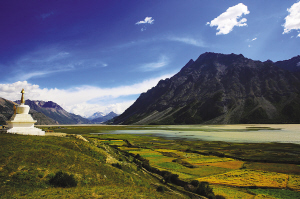 我們沿著湖畔徜徉,不經(jīng)意間步入了一片牧場(chǎng),只見一群牦牛在吃草,遠(yuǎn)處的崗日嘎布雪山神奇而壯麗。雪山的冰雪融水構(gòu)成了然烏湖主要的補(bǔ)給水源,然烏湖向西蜿蜒十余千米逐漸收縮成一道河谷,旁邊有一處藏族的小村莊,美得好像世外桃源一般,這就是傳說(shuō)中的瓦巴村。村民們依湖而居,湖邊的平地是他們的牧場(chǎng)和田埂。散落在這里的幾戶人家,屋旁都插著顏色各異的經(jīng)幡,隨風(fēng)陣陣擺動(dòng)。