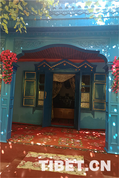 除了古老的純木質(zhì)結(jié)構(gòu)民宿,喀贊其還有各式磚石結(jié)構(gòu)的民居。院落寬敞明亮、華麗氣派,家家種植著花草、蔬菜,郁郁蔥蔥、生機(jī)盎然,葡萄廊架已成為每家的“標(biāo)配”,葡萄架下是家人休閑、朋友聚會(huì)的地方。圖為當(dāng)?shù)孛窬釉簝?nèi)。