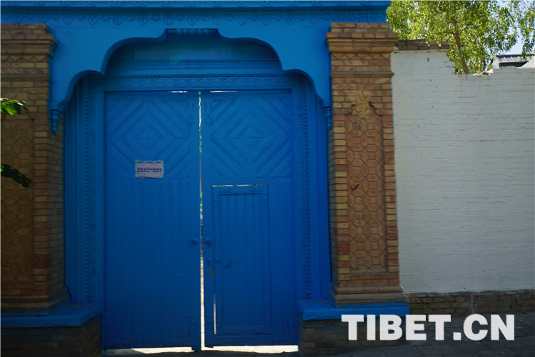 目前,喀贊其仍保留著一定數(shù)量的文物古跡,包括自治區(qū)級(jí)文物保護(hù)單位1個(gè)(陜西回族大寺),市級(jí)文物保護(hù)單位7個(gè),另有12處清真寺建筑。圖為具有當(dāng)?shù)靥厣呐R街藍(lán)色大門(mén)。