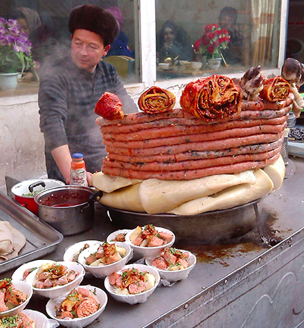 新疆盛產(chǎn)牛羊,是我國(guó)主要畜牧業(yè)基地之一。信仰伊斯蘭教的民族以食牛羊肉為主。牛羊肉風(fēng)味小吃名類繁多自不待言,就是以羊的內(nèi)臟作原料,也能烹制出鮮香異常的美味來。米腸子與面肺子便是其中的代表。