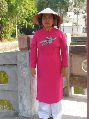 京族婦女的上衣與男性相反,是無(wú)領(lǐng)、開(kāi)襟、有三粒紐扣的短上衣。婦女的衣衫較短,衫角的長(zhǎng)度只到人的腰部,沒(méi)有蓋過(guò)臀部,所以有“長(zhǎng)不及臀”的講法。婦女的短上衣衣袖較窄,和男性的沒(méi)有差別,衣袖的寬度剛好能穿過(guò)手臂。婦女上衣袒胸之處遮以一塊繡有圖案的菱形小布,年輕人多為紅色,中年人多為淺紅或米黃色,老年人通常為白色或藍(lán)色,這種小布通常稱為“遮胸”,是婦女常用的裝飾品之一。其褲子寬闊度與男性無(wú)異。京族婦女傳統(tǒng)服飾采用的顏色有年齡之分。青年、中年女性穿的上衣通常選用白、藏青或草綠等顏色,褲子多選用黑色、褐色;老年婦女衣褲則多選用黑色、棕色等。在衣服用料選擇上,則視貧富而定。大部分家境一般的京族人用的是自己生產(chǎn)的粗糙棉麻布,而富裕的人家選用蠶絲品或者貴重的綾羅綢緞為衣服料子。