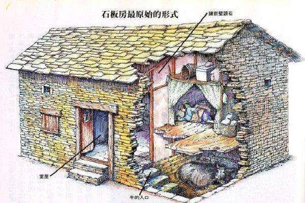 石板房以石條或石塊砌墻,墻可壘至5至6米高;以石板蓋頂,風(fēng)雨不透??傊?,除檁條、椽子是木料外,其余全是石料,甚至家用的桌、凳、灶、缽都是石頭鑿的。一切都樸實(shí)無華,固若金湯。這種房屋冬暖夏涼,防潮放火,相對(duì)采光較差。