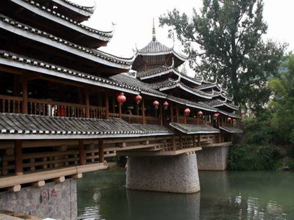 瑤族風雨橋,又被稱之為“涼橋”或“風水橋”。除木橋外,大多是在石拱橋上加蓋橋廊、橋亭和在橋頭的橋臺上建閣樓,穿斗式木構(gòu)架,二層檐或三層檐,有的四層檐,通高在9米~10米間。風雨橋不僅是路人避雨之處,也是瑤族男女青年談情說愛的約會場所。廣西瑤族風雨橋主要集中在富川瑤族自治縣和恭城瑤族自治縣。富川縣保存至今的古代瑤族風雨橋有18座,其中著名的有迥瀾橋(建于明萬歷年間),青龍橋(與前者同時期修建),以及福壽橋、高橋、鳳溪新橋、皇侯泉橋、東轅橋、鸕鶿塘瀾通橋、龍歸橋、興隆橋等。
