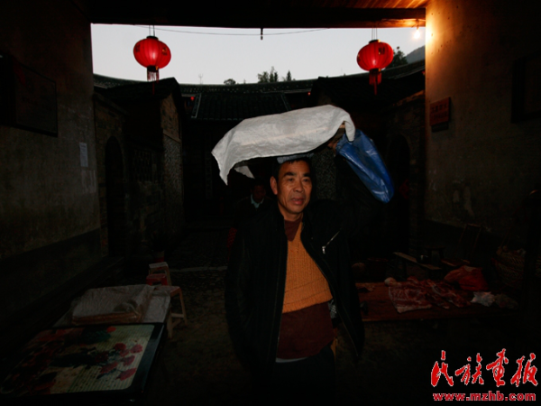 傍晚六點,江勝洪等人相繼趕到承啟樓祖堂。在那里,“龍”已經(jīng)倚靠在墻邊,靜靜地等待一年僅有的這幾天。人們首先給龍頭系上一塊紅布,象征吉祥。另一邊,排在第11位的江斌正在往竹筒里灌煤油,做晚上上山的火把。