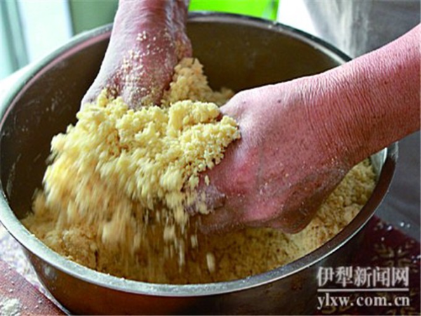 拜列西的做法有很多種,其中以用羊肉、洋蔥、土豆或南瓜為主要食材的伊提拜列西(肉拜列西)和以蘋(píng)果為食材的阿勒瑪拜列西(蘋(píng)果拜列西)為主。羊肉切薄片,土豆切小方塊,洋蔥切丁,倒在一起,擱置一旁,開(kāi)始和面。和面是制作拜列西過(guò)程中一項(xiàng)至關(guān)重要的環(huán)節(jié),面和得好壞直接會(huì)影響到烤出來(lái)的拜列西的美觀程度和口感的酥脆程度。