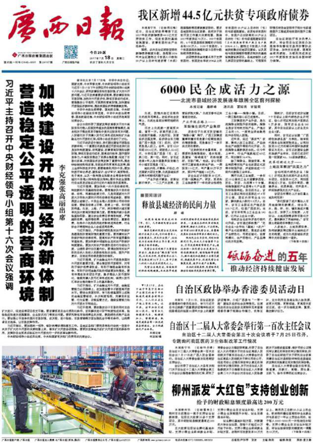 《廣西日?qǐng)?bào)》(Guangxi Daily)作為中共廣西壯族自治區(qū)委員會(huì)機(jī)關(guān)報(bào),以報(bào)道廣西重大新聞的權(quán)威性深得讀者看重,是廣西4800萬人民了解國家以及廣西重大時(shí)政、經(jīng)濟(jì)、社會(huì)信息的重要媒體,同時(shí)也成為外界觀察了解廣西的重要窗口。