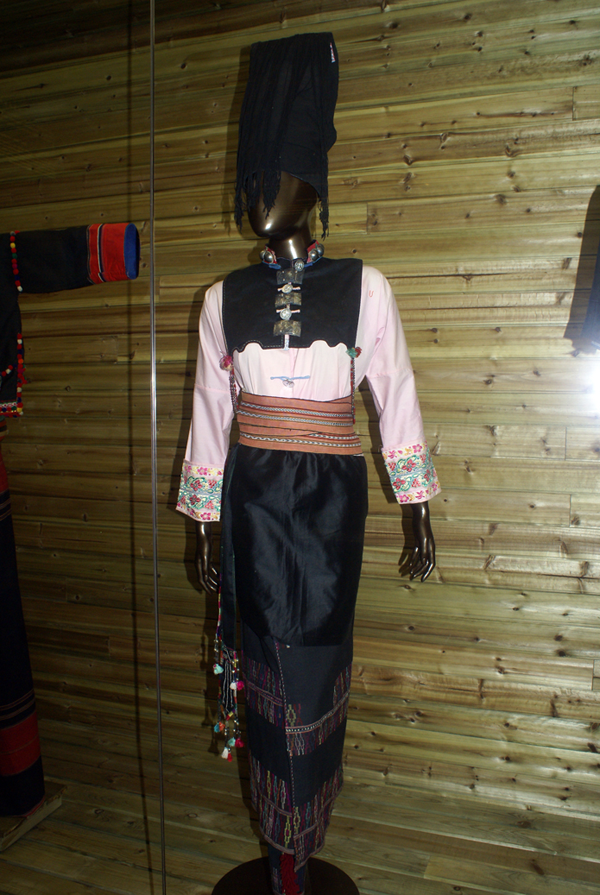 男子穿對(duì)襟上衣,下著黑褲,斜背“筒帕”,喜歡在胸前戴朵紅絲線結(jié)成的菊花。未婚男子戴白包頭,已婚男子戴藏青色包頭,青壯年在腦后留一尺多長的包布,有隨身佩帶刀的習(xí)俗,其中“戶撒刀”最為有名。
