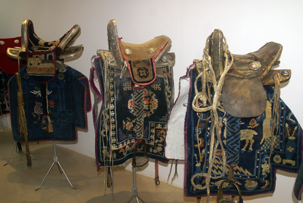 裝飾弓、矛、劍、盾、箭筒,尤其馬鞍,是蒙古族牧民的一貫愛(ài)好。大汗的坐椅是包金的,龍頭虎狀,鞍馬帶上亦以黃金盤龍為飾。鞍鞒喜歡配有各種裝飾,有的繪制圖案,有的用骨雕鑲嵌,有的鑲嵌金屬工藝制品。蒙古人更喜歡銅壺、銀碗、金杯等飲食器具。