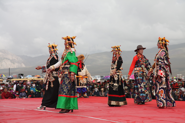 藏族人喜歡珠光寶氣的配飾,普遍用珠寶、金銀、玉器等配飾物裝扮自己,并將其看作是財(cái)富和美的象征。藏族的配飾物很多,從頭到頸、耳、胸、腰、腕、指、腿、腳都有。