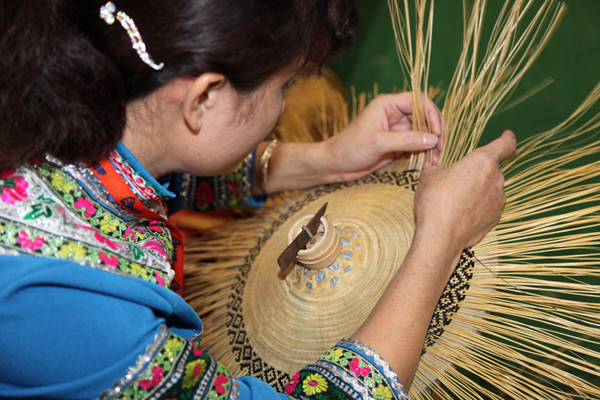 三角鉤鋤是毛南族特有的生產(chǎn)工具,毛南語叫“拱”。它小巧輕便,適合在雞窩地里中耕鋤草,又用于點(diǎn)種黃豆。種黃豆還有一種木制的“點(diǎn)穴錘”,用8寸到1尺長的金剛木削成圓桿,形如搟面杖,中間插一木柄,手握木柄在泥土里一錘,就成一個如雞蛋形的坑,即可放入黃豆,蓋上草木灰。這種“點(diǎn)穴錘”一錘一穴,工效很高,是種黃豆的最佳農(nóng)具。此外還有禾剪、割煙刀等(圖為毛南族織錦)。