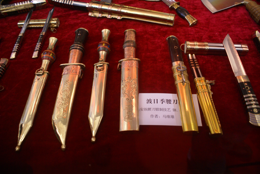 保安腰刀,是保安族的傳統(tǒng)工藝品,由于其打造技藝精悍,與新疆的英吉沙小刀、云南阿昌族的戶撒刀并稱為“中國(guó)少數(shù)民族三大名刀”,在中外都享有盛譽(yù)。保安腰刀品種繁多,有“什樣錦”、“雅五其”、“雙落”、“滿把”、“扁鞘”、“雙刀”、“細(xì)螺”、“波日季”、“哈薩刀”、“蒙古刀”等,刀面上刻 “七顆星”、“五朵梅”、“一條龍”、“一把手” 等圖案,這些圖案通常為鐵匠代號(hào),即一看刀面團(tuán)就知道是哪位鐵匠所制,而有的圖案則是記載保安鐵匠的遭遇。保安腰刀中,最為漂亮的要數(shù)“什樣錦”,“波日季”則名氣最大。