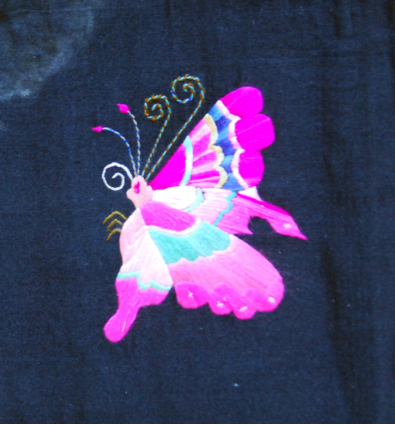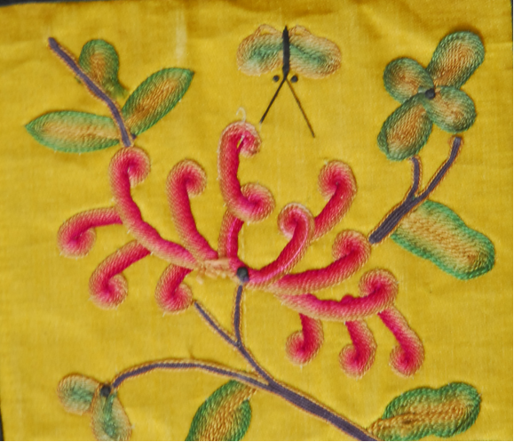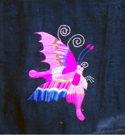 5.拽蜂,是在面料平底上繡制出立體的蝴蝶。由于繡工精細(xì),找不出怎樣連接繡制的地方,好像從布地子上拽出來(lái)的蜂,“拽蜂”之得名,古代稱蝴蝶為蜂。