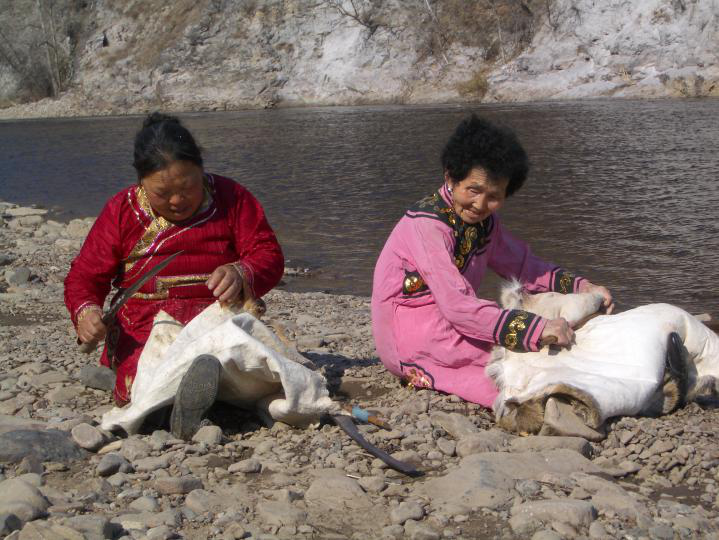鄂倫春人過去在家庭公社“烏力鄰”里,同生產(chǎn)共消費(fèi),在當(dāng)時生產(chǎn)力十分低下的情況下,憑著扎槍和弓箭,單個人很難獲得能夠滿足衣食需要的獵物,必須要有“烏力鄰”全體成員的通力合作,才能戰(zhàn)勝兇猛和龐大的野獸,所以,在“塔坦達(dá)”領(lǐng)導(dǎo)下的集體狩獵是當(dāng)時最主要的勞動形式。隨著生產(chǎn)力的不斷發(fā)展和個體小家庭的大量流動,不僅社會組織“烏力鄰”由原來血緣性的家庭公社演變?yōu)榈鼐壭缘牡赜蚬?,勞動組織也隨之發(fā)生了極大的變化。集體狩獵已不再是“烏力鄰”傾巢出動,而是由幾個小家庭的成員自愿結(jié)合成“安嘎”來進(jìn)行。同時還出現(xiàn)了集體和個人等多種勞動形式。狩獵也不再單純是為了滿足衣食的需要,剩余獵物可以拿去交換,獵產(chǎn)品已趨于商品化。故此時一些珍貴的細(xì)毛皮張和藥用價值較高的獸類,成了鄂倫春人主要的狩獵目標(biāo)。這樣就形成了一年中的四個狩獵旺季,即:農(nóng)歷正月至2月是“鹿胎期”;4月至6月是“鹿茸期”;9月至落雪為“叫鹿尾期”;落雪后至來年開春是“打皮子期”。大概是源于原始的圍獵,鄂倫春人把狩獵叫“打圍”,而這四個狩獵旺季就叫“紅圍期”?!凹t圍期”除“叫鹿尾期”外,都組織“安嘎”集體出獵?!鞍哺隆笔且环N臨時性的狩獵組織,狩獵旺季將臨時,由一人發(fā)起,串聯(lián)幾位親朋好友或志趣相投的人組成一個“安嘎”,待獵期結(jié)束,“安嘎”自行解散,下次出獵時再重新組合,因此其成員并不是固定的(圖為熟化狍皮,吳雅芝攝影)。