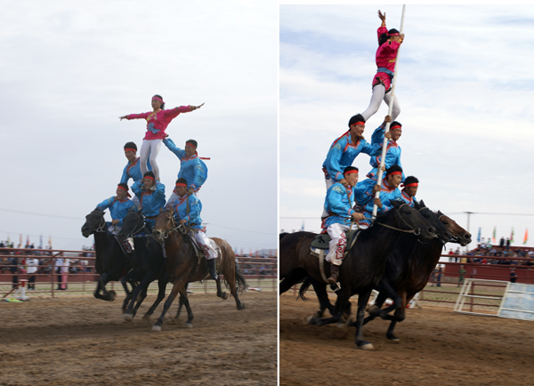 蒙古族的馬術(shù)表演非常精彩,有很多項(xiàng)目。“跨越障礙”是在運(yùn)動(dòng)場(chǎng)跑道上每隔幾十米設(shè)置一個(gè)高1米的跨欄。跑道終端立著一個(gè)直徑約2米的火圈,矯健的坐騎從起跑線踏蹄起跑,越過跨欄,鉆過火圈直達(dá)終點(diǎn)?!俺笋R斬劈”是在200-250米的距離之間樹起十幾個(gè)目標(biāo)。騎手們手持馬刀,疾馳如飛,經(jīng)過一個(gè)個(gè)目標(biāo)時(shí)舉刀劈砍,刀起標(biāo)落?!榜R上技巧”是由運(yùn)動(dòng)員們?cè)陲w馳的馬背上做出各種造型動(dòng)作。運(yùn)動(dòng)員一般八九歲就要在馬術(shù)隊(duì)接受嚴(yán)格的訓(xùn)練。技巧表演可分單項(xiàng)和多項(xiàng),其中又包括單人單馬、單人雙馬、雙人雙馬和多人多馬。一匹飛奔的馬經(jīng)過騎手身邊,騎手可以突然抓住馬鬃翻身上馬,又會(huì)突然下馬腳尖點(diǎn)地再躍上馬背。其他技巧還有在馬背上“空翻倒立”“側(cè)方隱蔽”“樓里藏身”以及驚險(xiǎn)的“馬上疊羅漢”等表演【如圖,劉軍攝影,編者修剪合成兩圖】。
