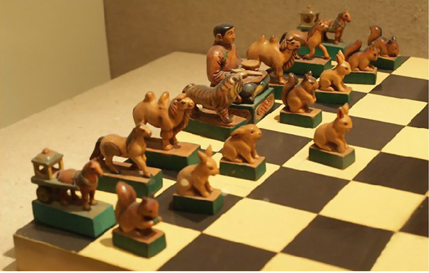 據(jù)清葉明澧《橋西雜記》載,蒙古象棋的棋制和著法乃:“局縱橫九線,六十四卦。棋各十六枚:八卒、二車、二馬、二象、一炮、一將,別以朱墨,將居中之右,炮居中之左,車,馬、象左右列,卒橫于前,棋局無(wú)河界,滿局可行,所謂隨水草以為畜牧也。其棋形而不字,將刻塔,崇象教也。象改駝或熊,迤北無(wú)象也。卒直行一卦至底,斜角食敵之在前者,去而復(fù)返,用同于車,嘉有功也。馬橫行六卦,駝可斜行八卦,因沙漠之地,駝行疾于馬也。車行直線,進(jìn)退自由。群子環(huán)擊一塔,無(wú)路可出。始為敗北”【劉軍供圖】。