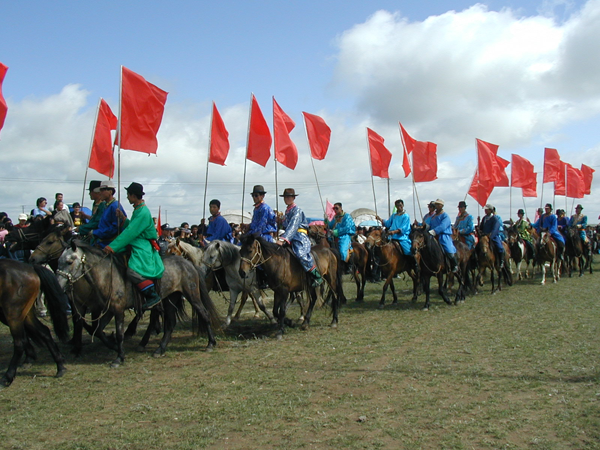 蒙古民族幾乎人人都天生酷愛馬,也很會(huì)訓(xùn)練馬,若在過去,作為馬背民族更是離不開馬。好馬、好騎手一直享有極高的榮譽(yù)。因此,賽馬當(dāng)然成為牧民最喜愛的運(yùn)動(dòng)。蒙古族賽馬一般分賽走馬和賽奔馬兩種。賽走馬是指讓鞍具齊全并釘有合適馬掌的馬跑對(duì)側(cè)步(即前后蹄一順交錯(cuò)前進(jìn)),比馬的速度、耐力、穩(wěn)健和美觀。有豐富經(jīng)驗(yàn)者才能騎出走馬來(lái),所以,參賽的馬多用5歲以上的成年馬,騎手也以成年人為主。比賽時(shí),要求騎手有高超的騎術(shù),能夠駕馭好馬,使其既走得快、穩(wěn)、美,又不能跑起來(lái)。還要求馬抬步越高越好,這樣顯得很有“風(fēng)度”,這不僅取決于馬掌的重量,還要看馬的素質(zhì)。一匹好的走馬,即便在牧區(qū)也價(jià)格非常昂貴。賽奔馬是比馬的速度和耐力,以先到達(dá)終點(diǎn)者為勝。奔馬的步伐與走馬不同,是四蹄分前后成雙交錯(cuò)奔跑。參賽的選手多為十二三歲的小男孩,因?yàn)樗麄凅w輕敏捷。為了減輕馬的負(fù)荷和照顧騎手的安全,奔馬都不備鞍具或配備輕巧的鞍具。騎手們只穿華麗的彩衣,頭束紅綠飄帶,顯得英武、神氣。賽程一般長(zhǎng)25至35千米。奔馬賽比走馬賽普遍,參賽的人數(shù)也多,少則幾十,多則逾百。比賽開始,選手們迅速躍馬,揚(yáng)鞭飛奔,觀眾則雀躍歡呼,吶喊助威【圖為馬隊(duì)進(jìn)場(chǎng)儀式,劉軍攝影】。