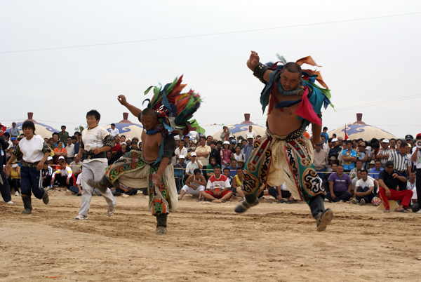 蒙古族摔跤(搏克)既不同于中國(guó)式摔跤,也不同于日本的相樸,其規(guī)則、方法、服裝、場(chǎng)地等方面都有自己的特點(diǎn)。比賽規(guī)則和方法是:不分等級(jí)(不分年齡、不分體重),沒有人數(shù)限制,只要是2、4、6、8、16、32、64、128等雙數(shù)即可。所有選手由德高望重的裁判負(fù)責(zé)編排配對(duì)或抽簽配對(duì)后上場(chǎng)。比賽實(shí)行單淘汰制,一跤定勝負(fù),失敗者不許再上場(chǎng)。每輪淘汰半數(shù)。裁判員發(fā)令后,雙方握手致意,然后開始交鋒,一般不限時(shí)間,可以采取勾、拉、踢、絆、推、抱、舉等各種方法和技巧,但不能抱腿摔,也不準(zhǔn)亂踢,更不能扯褲子,膝蓋以上任何部位著地即為失敗。摔跤手有專用服裝,上身為牛皮或帆布制成的緊身半袖坎肩“昭德格”,下穿肥大的摔跤褲,腳蹬蒙古靴,頸上套五顏六色的布條項(xiàng)圈。比賽場(chǎng)地簡(jiǎn)單,只要有一片草坪或松軟空地,觀眾席地圍坐,摔跤手就可以在中間進(jìn)行比賽。賽前,雙方都有人高唱挑戰(zhàn)歌,以造聲勢(shì)。摔跤手入場(chǎng)、退場(chǎng)時(shí)都要模仿虎步或鷹步動(dòng)作,跳躍行進(jìn),威武雄壯。冠軍獲重獎(jiǎng),并在民間享有極高聲譽(yù)【圖為跳躍入場(chǎng)的摔跤手,劉軍攝影】。