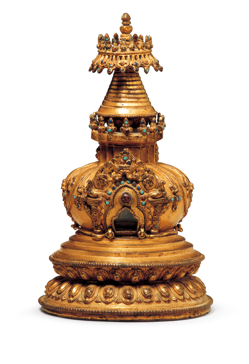 青海一些牧區(qū),天葬日凌晨,死者最小的兒子將尸體抱出帳蓬,人們把已經(jīng)捆好的尸體和一個裝滿土石的口袋連接起來搭在牛背上,或由天葬師背尸體到火葬場,送葬者不能回頭、不能喧嘩、不能停步。到天葬臺后,除留一個非親屬的老人外,其余人全部撤離,然后天葬師將尸體肢解喂禿鷲。如果禿鷲將碎尸吃干凈,意味著死者生前行善積德,其靈魂已升天,如果禿鷲沒吃干凈,說明死者生前有罪孽,家人要給寺院布施,請求寺院僧人再做法事,以贖死者罪惡,讓靈魂早日升天(圖為鎏金紫銅舍得塔)。
