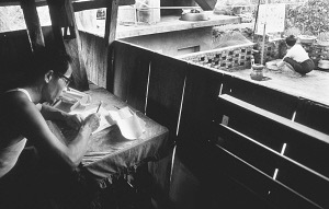 從前的“朵薩拉”是用芭蕉葉做的,現(xiàn)在有紙了,就把字寫在紙上,再用芭蕉葉卷起,用細篾絲捆扎好(因為在芭蕉葉上寫字實在不好寫,就做了一些改進)。“朵薩拉”里裹寫著的是各家各戶賧奉物品的姓名、清單、及賧奉人的愿望,老人們把10個“朵薩拉”捆成一捆,分發(fā)給來自全壩子14個緬寺的19個大佛爺和137個小和尚。這次全村共賧奉了3059份物品,每個佛爺兩捆“朵薩拉”,小和尚一捆,剩余的全奉給緬寺。