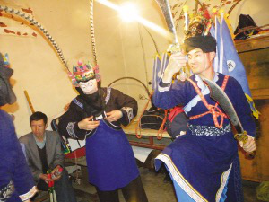 請“臉子”是地戲表演時一個非常講究的開場儀式?!巴捅さ貞颉钡恼埬樧觾x式通常是整個戲班子的人都必須參加祭拜。表演時必須鄭重地從箱子里請出珍藏的“臉子”,“臉子”才具有神的靈性??墒俏覀兛吹降拇笳家赖貞颍诒3謧鹘y(tǒng)的同時又不失自己的個性。通常請“臉子”是由當(dāng)?shù)亻L老一個人完成所有的祭拜過程,一切都是那么簡單。祭拜中都是用當(dāng)?shù)氐牟家涝掓告傅纴?,這樣的表演給它增添了別有的韻味。