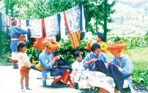 季節(jié)在閑著,整個寨子卻在忙。漢子們隨意兜幾個煨熟的紅薯,就出門挖山土、砍柴火去了。女人們則湊到一起說著、笑著或哼著,專心做起她們心愛的挑花活計來。吊腳樓、屋檐下、火塘邊、堂屋里、巖石上、小溪旁,到處都散落著三三兩兩挑繡花裙的姑娘。提起挑花,姑娘們可就來神了,個個都有一手好絕活,誰都可以說出好幾個道道來。她們從六七歲時起,就要在娘手把手的嚴格規(guī)訓下,穿針引線,學著挑花。年復一年,傾其心智,從不間斷,直到終老。