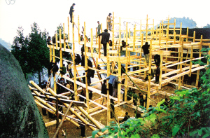 花瑤同胞修建新屋,至今沿襲著奇特古老的巫風。對于宅基地的選擇要請地仙擇地,幫助選向和挑選動工日期。待三柱或五柱一扇的木架子做好后,豎架上梁的那天,全寨的親鄰都會主動來幫忙。用繩子拉的、用叉子撐的、用肩膀頂?shù)?、用木槌敲的、用雙手推的,各居各位后,一聲喊起,—扇木架瞬間立于宅基上了。