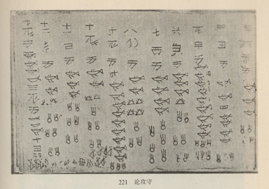 水書抄本。寫于清嘉慶年間,共20頁,長18厘米,寬27厘米。以竹簽作筆蘸墨書寫。內(nèi)容述戰(zhàn)爭陣法。中圖魚形表示守方,方框為指揮位置,三角形表示山頭陣地,圓圈加三畫表示進(jìn)攻之?dāng)硵⊥诵蜗?。原件存北京圖書館。