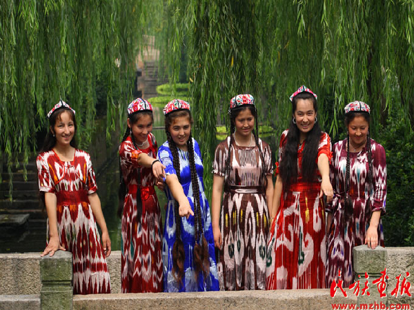 如果說苗族服飾是苗族的一部“無字史書”的話,那新疆維吾爾族的艾德萊斯綢和小花帽則是維吾爾族熱情奔放性格的集中體現(xiàn)。艾德萊斯綢質(zhì)地柔軟,輕盈飄逸,非常適合縫制夏裝。按顏色分為黑艾德萊斯、紅艾德萊斯、黃艾德萊斯和多色艾德萊斯。紅艾德萊斯綢圖案為紅色,底色用黃色或白色,富于青春氣息,深受姑娘和少婦的喜愛。黃艾德萊斯綢圖案為黃色,在各種底色的襯托下顯得莊重而典雅,顯示一種富貴氣息,一般在制成中青年婦女服裝的時候使用。綠艾德萊斯綢多用來縫制學齡前兒童的女裝。維吾爾族無論男女老幼,不分春夏秋冬,都喜歡戴一種維吾爾族語稱為“朵巴”的小花帽,制作小花帽運用絲線平繡、絲線結繡、串珠片繡、格子架繡、盤金銀繡、十字花繡、鉤花刺繡、扎絨刺繡以及刺、扎、串、盤等技法,將花卉果實等圖案匯集在帽子中,使小花帽的顏色豐富多彩。