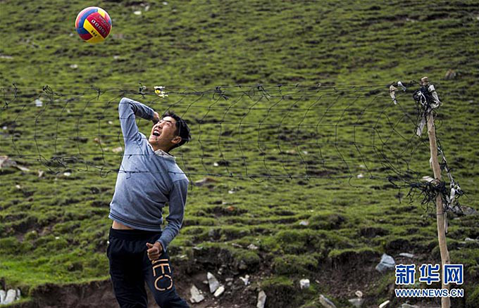 開學就該上高三的喀拉塔什其木干村村民圖潤塔依·艾沙買買提用木棍和簡易的網(wǎng)子在家門口的空地上劃了一塊排球場