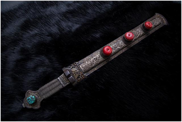 安多地區(qū)主要以放牧為主,牧民的刀主要用于宰殺和吃肉,有嚴格的男用女用之分,男式刀長度在一尺以上,女式刀在一乍左右,刀鞘的底部和刀柄的末端上翹,呈船形。安多人喜歡珠寶,頭飾、胸飾、腰飾無不光燦耀人,這些飾物同樣被用在刀上,刀鞘和刀柄錨金錯銀,鑲嵌著珊瑚和綠松石,像精美的藝術(shù)品。