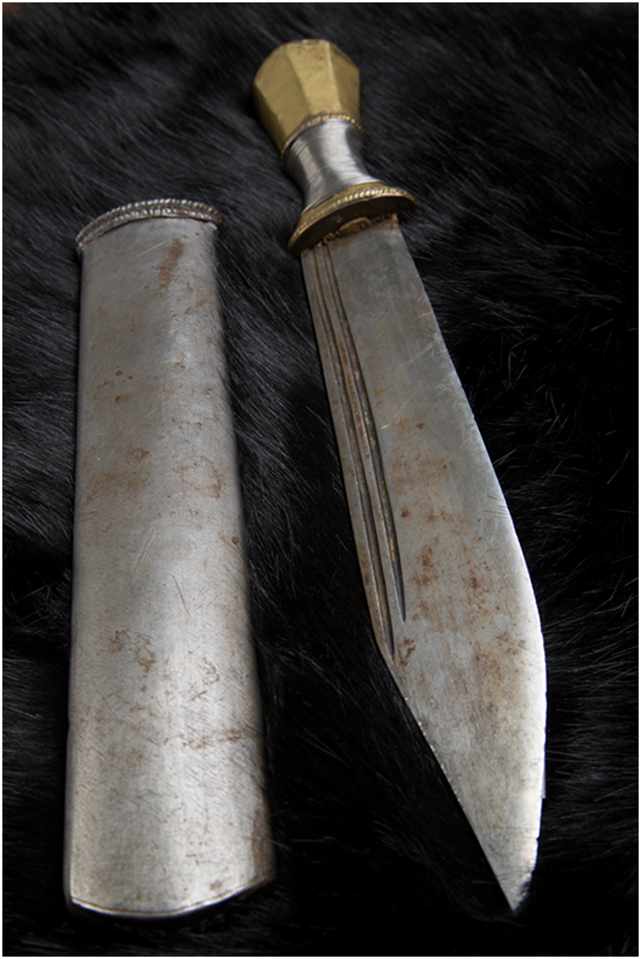 地處藏東的林芝地區(qū)一帶,也叫貢布地區(qū),居住著藏族、門巴族和珞巴族,這里山高林密,野獸出沒其間,靠山吃山,人們伐薪狩獵是家常便飯。所以人們使用的刀具以寬、長為多。刀鞘多為木質(zhì),外面用獸皮包裹,一般是用野獸腿骨上的皮,有些還帶有爪子。外在裝飾主要是附在獸皮上的毛色和趾爪。其用途除了捕獵格斗,更是人們在密林中劈荊斬棘的利器。