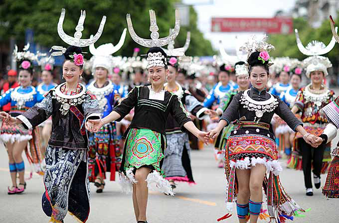 2017年4月28日,黔東南苗族侗族自治州丹寨縣盛大舉行“云上丹寨?遠古霓裳”丹寨八大支系服飾巡游活動,來自全縣六個鄉(xiāng)鎮(zhèn)八大支系的2000余名苗族同胞身著節(jié)日盛裝,集聚在縣城錦雞廣場進行服飾展演(黔東南苗族侗族自治州人民政府網(wǎng))
