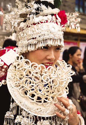 位于貴州省黔東南苗族侗族自治州臺江縣的施洞小鎮(zhèn),依仗著清水江流域便利的交通和發(fā)達的木材貿(mào)易,白銀作為貨幣在當?shù)氐玫酱罅苛鬓D(zhuǎn)與積累。施洞地區(qū)的苗族,長期保持著以銀為飾的佩戴喜好和以“盛”為美的裝飾理念。施洞苗族銀飾也因其造型最為繁麗、銀質(zhì)最為優(yōu)良、工藝最為精細,從黔東南諸多苗族支系中脫穎而出,成為苗族“盛飾”的典范。